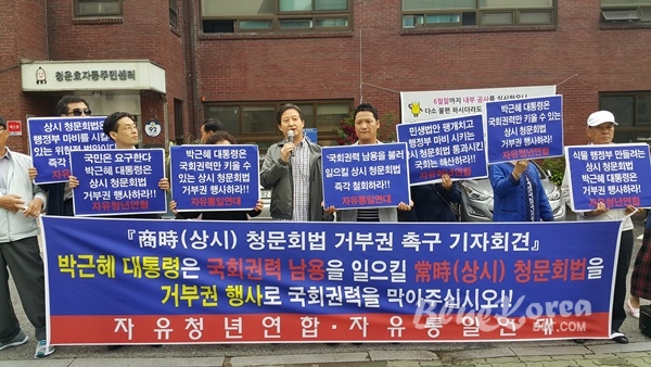 [ÀÌ»óõ ±âÀÚ=Ǫ¸¥Çѱ¹´åÄÄ]24ÀÏ ÀÚÀ¯Ã»³â¿¬ÇÕ°ú ÀÚÀ¯ÅëÀÏ¿¬´ë´Â ȸ¿øµéÀº Á¾·Î±¸ û¿îµ¿Áֹμ¾ÅÍ ¾Õ¿¡¼ ¹Ú±ÙÇý ´ëÅë·ÉÀÇ ‘»ó½Ãû¹®È¸¹ý’°ÅºÎ±Ç Çà»ç¸¦ Ã˱¸ÇÏ´Â ±âÀÚȸ°ßÀ» ¿¾ú´Ù.