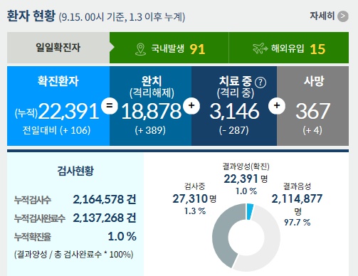 [¹Ú¿µ¿ì ±âÀÚ=Ǫ¸¥Çѱ¹´åÄÄ] Áúº´°ü¸®Ã»¿¡ µû¸£¸é 9¿ù 15ÀÏ 0½Ã ±âÁØ ½ÅÁ¾ Äڷγª19(¿ìÇÑ Æó·Å) ±¹³» ¹ß»ýÇöȲÀº Àü³¯º¸´Ù 106¸í Áõ°¡ÇÑ ÃÑ 22,391¸íÀÌ´Ù.