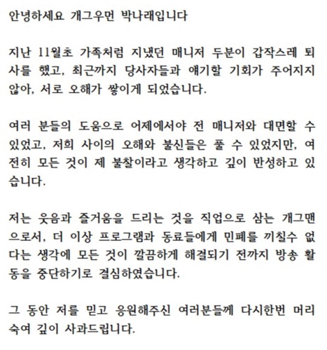 ¹Ú³ª·¡´Â “¿ôÀ½°ú Áñ°Å¿òÀ» µå¸®´Â °ÍÀ» Á÷¾÷À¸·Î »ï´Â °³±×¸ÇÀ¸·Î¼ ´õ ÀÌ»ó ÇÁ·Î±×·¥°ú µ¿·áµé¿¡°Ô ¹ÎÆó¸¦ ³¢Ä¥ ¼ö ¾ø´Ù´Â »ý°¢¿¡ ¸ðµç °ÍÀÌ ±ò²ûÇÏ°Ô ÇØ°áµÇ±â Àü±îÁö ¹æ¼Û Ȱµ¿À» Áß´ÜÇϱâ·Î °á½ÉÇß´Ù”¸ç “±×µ¿¾È Àú¸¦ ¹Ï°í ÀÀ¿øÇØ ÁֽŠ¿©·¯ºÐµé²² ´Ù½Ã Çѹø ¸Ó¸® ¼÷¿© ±íÀÌ »ç°úµå¸°´Ù”°í Çß´Ù.